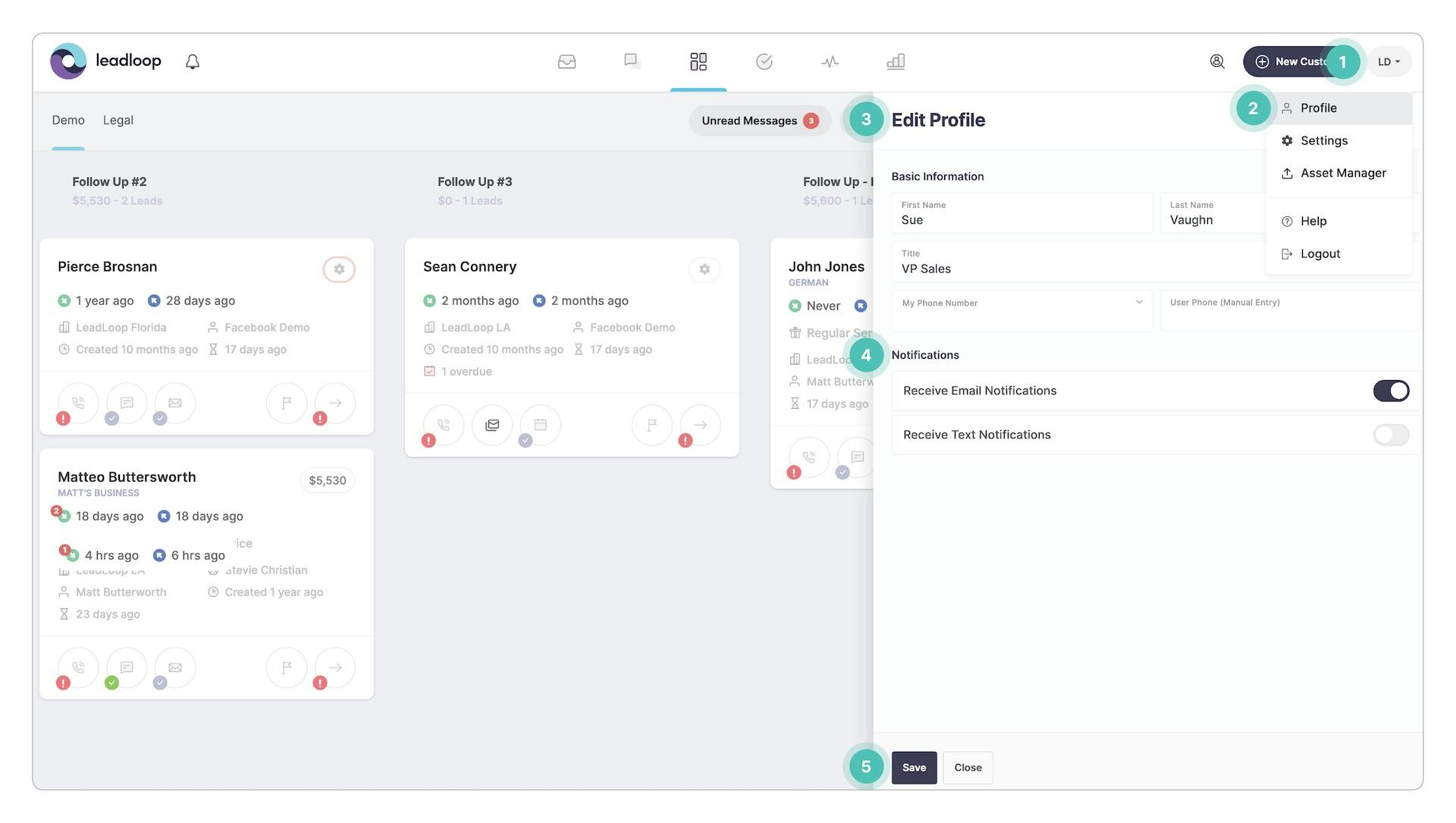 Profile settings determine how Users appear across LeadLoop, how they make outbound communications, and whether they receive email and/or text notifications each time a message is received.
