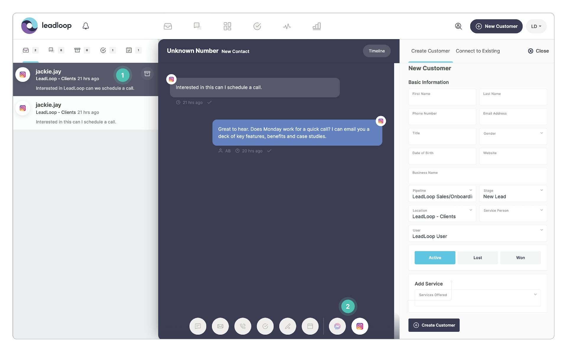 Inquiries received via Facebook or Instagram can be responded to right from within LeadLoop.